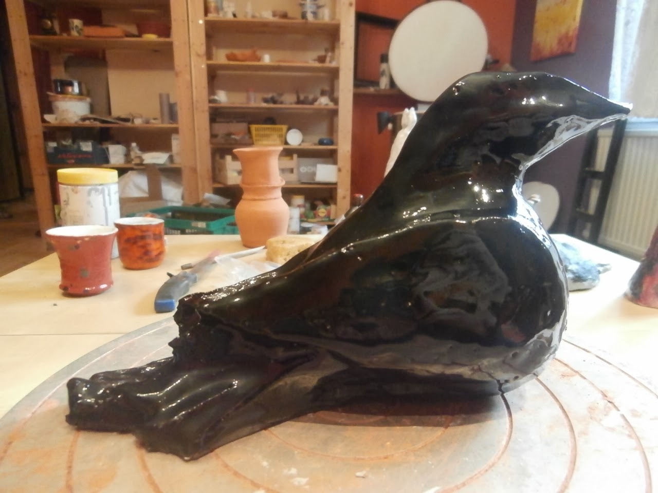 Na zamówienie Kawkiczarnej powstały dwie czarne kawki. Obie pokryte szkliwem, którego używałam pierwszy raz. Jednym jestem zachwycona, tym przypominającym granit. Szkliwo błyszczące ma jednak stanowczo zbyt dużo blasku, jak na moje upodobania. Do tego stopnia, że nie wiem do czego je użyć. Chyba tylko do bardzo prostych przedmiotów, płaskich talerzy, bo rozbudowanym formom zabiera moc.